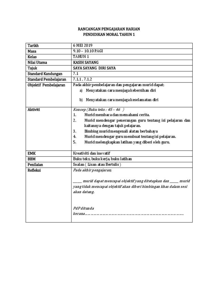 Rph Pendidikan Moral Tahun 1 Saya Sayang Diri Saya Pdf